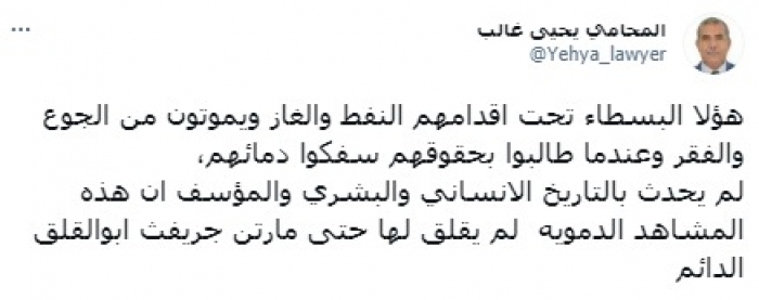 وقال في تغريدة على حسابه بموقع التدوين المصغر تويتر، اليوم إن: "هؤلا البسطاء تحت أقدامهم النفط والغاز ويموتون من الجوع والفقر".