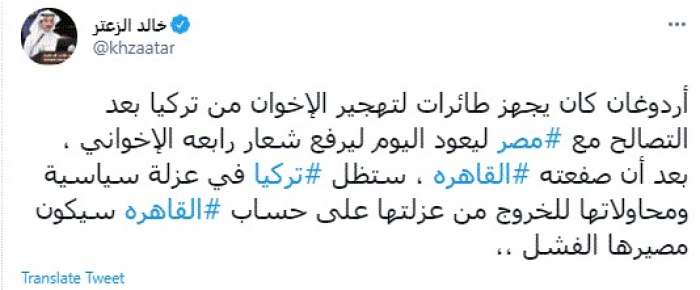 وكتب في تغريدة عبر "تويتر" رصدها "المشهد العربي": "أردوغان كان يجهز طائرات لتهجير الإخوان من تركيا بعد التصالح مع مصر ليعود اليوم ليرفع شعار رابعة الإخواني، بعد أن صفعته القاهرة، ستظل تركيا في عزلة سياسية ومحاولاتها للخروج من عزلتها على حساب القاهرة سيكون مصيرها الفشل".