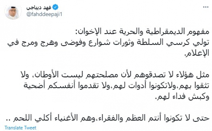 وقال في تغريدة عبر "تويتر" رصدها "المشهد العربي": "مفهوم الديمقراطية والحرية عند الإخوان: تولي كرسي السلطة وثورات شوارع وفوضى وهرج ومرج في الإعلام.