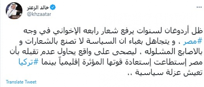 وكتب في تغريدة عبر "تويتر" رصدها "المشهد العربي": "ظل أردوغان لسنوات يرفع شعار رابعه الإخواني في وجه مصر، و يتجاهل بغباء أن السياسة لا تصنع بالشعارات وبالأصابع المشلولة، ليصحى على واقع يحاول عدم تقبله بأن مصر استطاعت استعادة قوتها المؤثرة إقليمياً بينما تركيا تعيش عزلة سياسية".