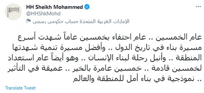 وقال في تغريدة عبر "تويتر" رصدها "المشهد العربي": "عام الخمسين عام احتفاء بخمسين عاماً شهدت أسرع مسيرة بناء في تاريخ الدول.. وأفضل مسيرة تنمية شهدتها المنطقة .. وأنبل رحلة لبناء الإنسان.. وهو أيضاً عام استعداد لخمسين قادمة .. خمسين عامرة بالخير .. عميقة في التأثير.. نموذجية في بناء أمل للمنطقة والعالم".