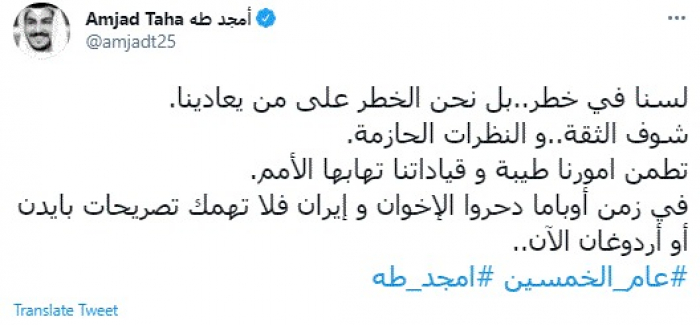 وقال في تغريدة عبر "تويتر" رصدها "المشهد العربي": "لسنا في خطر..بل نحن الخطر على من يعادينا. شوف الثقة..و النظرات الحازمة. تطمن امورنا طيبة و قياداتنا تهابها الأمم. في زمن أوباما دحروا الإخوان و إيران فلا تهمك تصريحات بايدن أو أردوغان الآن".