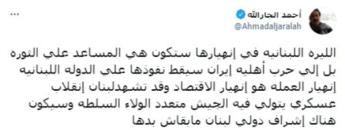 قال في تغريدة على حسابه بموقع التدوين المصغر تويتر، اليوم إن: "الليرة اللبنانية في انهيارها ستكون هي المساعد علي الثورة بل إلي حرب أهلية".