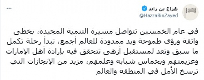 وأشار في تغريدة على حسابه بموقع التدوين المصغر تويتر، اليوم إلى أنه: "في عام الخمسين تتواصل مسيرة التنمية المجيدة، بخطى واثقة ورؤى طموحة ويد ممدودة للعالم أجمع".