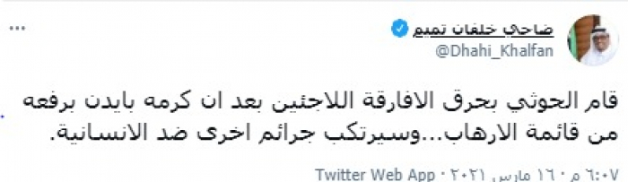 وأشار في تغريدة على حسابه بموقع التدوين المصغر تويتر، اليوم إلى أنه: "قام الحوثي بحرق الأفارقة اللاجئين بعد أن كرمه بايدن برفعه من قائمة الإرهاب"، مضيفا: "وسيرتكب جرائم أخرى ضد الإنسانية".