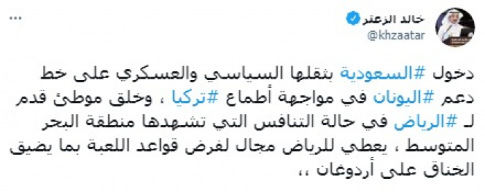 وأكد في تغريدة على حسابه بموقع التدوين المصغر تويتر، اليوم أن: "دخول السعودية بثقلها السياسي والعسكري على خط دعم اليونان في مواجهة أطماع تركيا، وخلق موطئ قدم للرياض في حالة التنافس التي تشهدها منطقة البحر المتوسط، يعطي للرياض مجالا لفرض قواعد اللعبة بما يضيق الخناق على أردوغان".