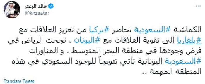 وكتب في تغريدة عبر "تويتر" رصدها "المشهد العربي": "الكماشة السعودية تحاصر تركيا من تعزيز العلاقات مع بلغاريا إلى تقوية العلاقات مع اليونان، نجحت الرياض في فرض وجودها في منطقة البحر المتوسط، و المناورات السعودية اليونانية تأتي تتويجاً للوجود السعودي في هذه المنطقة المهمة".