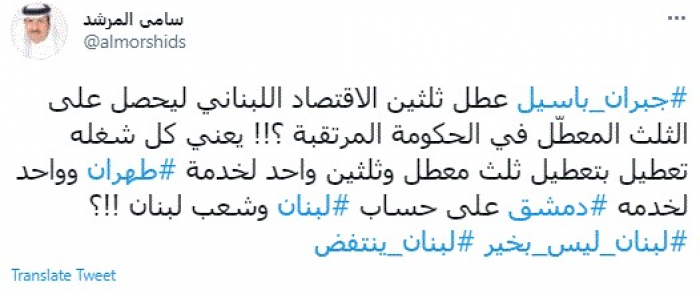 وقال في تغريدة عبر "تويتر" رصدها "المشهد العربي": "جبران باسيل عطل ثلثين الاقتصاد اللبناني ليحصل على الثلث المعطّل في الحكومة المرتقبة؟ يعني كل شغله تعطيل بتعطيل ثلث معطل وثلثين واحد لخدمة طهران وواحد لخدمة دمشق على حساب لبنان وشعب لبنان!".