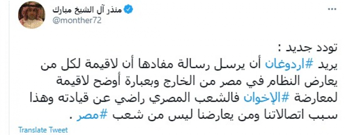 وقال في تغريدة عبر "تويتر" رصدها "المشهد العربي": "تودد جديد: يريد أردوغان أن يرسل رسالة مفادها أن لا قيمة لكل من يعارض النظام في مصر من الخارج وبعبارة أوضح لا قيمة لمعارضة الإخوان فالشعب المصري راضي عن قيادته وهذا سبب اتصالاتنا ومن يعارضنا ليس من شعب مصر".