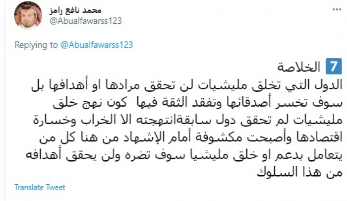 وكتب في تغريدة عبر "تويتر" رصدها "المشهد العربي": "الدول التي تخلق مليشيات لن تحقق مرادها أو أهدافها بل سوف تخسر أصدقائها وتفقد الثقة فيها كون نهج خلق مليشيات لم تحقق دول سابقة انتهجته إلا الخراب وخسارة اقتصادها وأصبحت مكشوفة أمام الإشهاد من هنا كل من يتعامل بدعم أو خلق مليشيا سوف تضره ولن يحقق أهدافه من هذا السلوك".