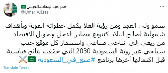 وقال في تغريدة عبر "تويتر" رصدها "المشهد العربي": "سمو ولي العهد ومن رؤية العلا يكمل خطواته القوية وبأهداف شمولية لصالح البلاد كتنويع مصادر الدخل وتحويل الاقتصاد من ريعي إلى إنتاجي صناعي واستثمار كل موقع جذب سياحي عبر رؤية السعودية 2030 التي حققت نتائج قياسية قبل اكتمالها آخرها برنامج صنع في السعودية".