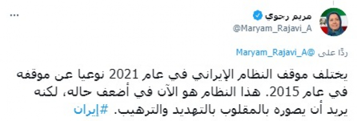 وشددت في تغريدة على حسابها بموقع التدوين المصغر تويتر، اليوم على أنه: "يختلف موقف النظام الإيراني في عام 2021 نوعيا عن موقفه في عام 2015".