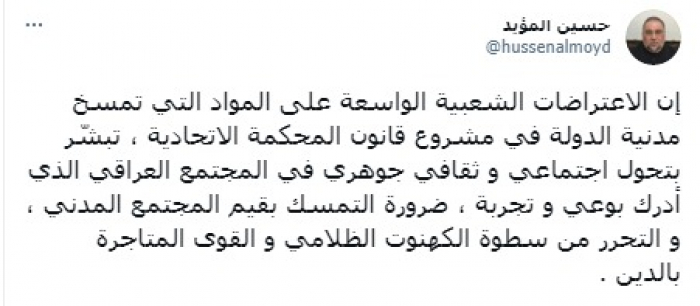 وشدد في تغريدة على حسابه بموقع التدوين المصغر تويتر، اليوم على أن: "الاعتراضات الشعبية الواسعة على المواد التي تمسخ مدنية الدولة في مشروع قانون المحكمة الاتحادية، تبشّر بتحول اجتماعي وثقافي جوهري في المجتمع العراقي".