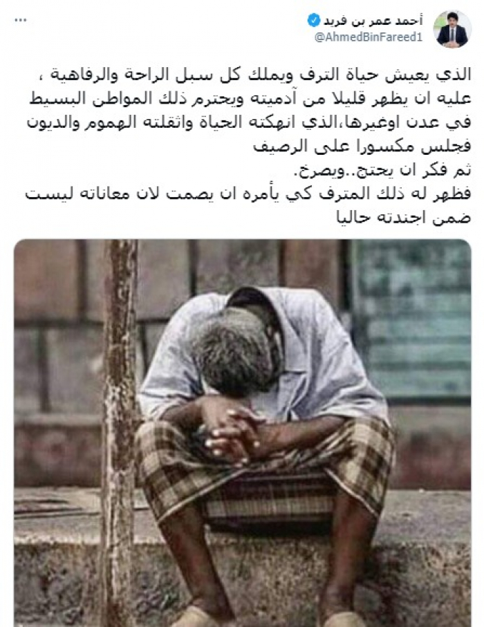 وقال في تغريدة على حسابه بموقع التدوين المصغر تويتر، اليوم إن: "الذي يعيش حياة الترف ويملك كل سبل الراحة والرفاهية، عليه أن يظهر قليلا من آدميته ويحترم ذلك المواطن البسيط في عدن أو غيرها الذي انهكته الحياة وأثقلته الهموم والديون فجلس مكسورا على الرصيف ثم فكر أن يحتج.. ويصرخ".