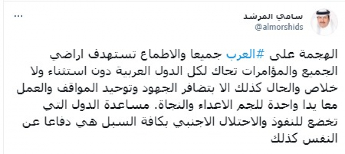 وأكد في تغريدة على حسابه بموقع التدوين المصغر تويتر، اليوم أن: "الهجمة على العرب جميعا والأطماع تستهدف أراضي الجميع والمؤامرات تحاك لكل الدول العربية دون استثناء".
