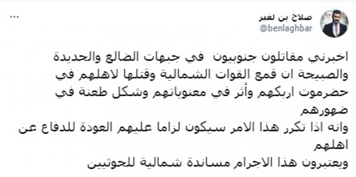 وأوضح في تغريدة على حسابه بموقع التدوين المصغر تويتر، اليوم أنه: "أخبرني مقاتلون جنوبيون في جبهات الضالع والحديدة والصبيحة أن قمع القوات الشمالية وقتلها لأهلهم في حضرموت أربكهم وأثر في معنوياتهم وشكل طعنة في ظهورهم".