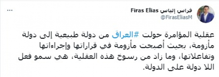 اعتبر الكاتب الصحفي فراس إلياس أن العراق تحول إلى دولة مأزومة نتيجة لعقلية المؤامرة السائدة.