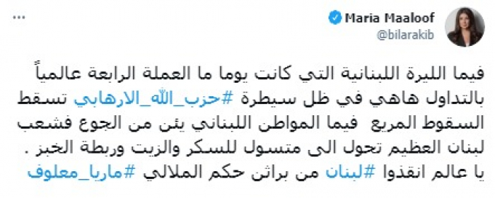 وأكدت في تغريدة على حسابها بموقع التدوين المصغر تويتر، اليوم أنه: "فيما الليرة اللبنانية التي كانت يوما ما العملة الرابعة عالمياً بالتداول هاهي في ظل سيطرة حزب الله الإرهابي تسقط السقوط المريع".