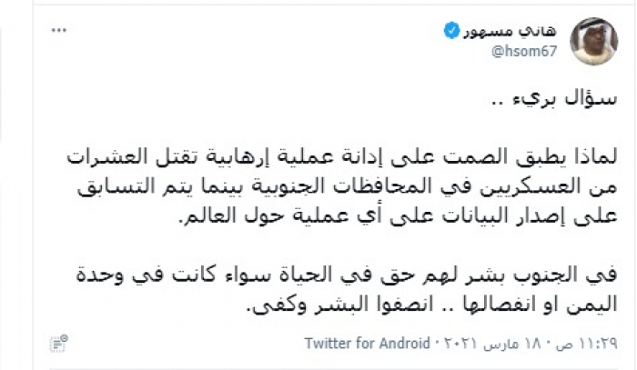 وطرح "مسهور" تساؤلًا عبر تغريدة بحسابه الشخصي على تويتر، رصدها "المشهد العربي": "سؤال بريء ..لماذا يطبق الصمت على إدانة عملية إرهابية تقتل العشرات من العسكريين في المحافظات الجنوبية بينما يتم التسابق على إصدار البيانات على أي عملية حول العالم".