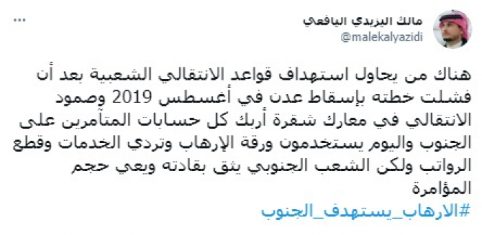ورأى في تغريدة على حسابه بموقع التدوين المصغر تويتر، اليوم أن: "هناك من يحاول استهداف قواعد الانتقالي الشعبية بعد أن فشلت خطته بإسقاط عدن في أغسطس 2019".