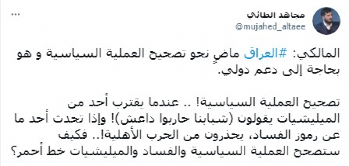 وأضاف: "تصحيح العملية السياسية!.. عندما يقترب أحد من الميليشيات يقولون (شبابنا حاربوا داعش)! وإذا تحدث أحد ما عن رموز الفساد، يحذرون من الحرب الأهلية!".