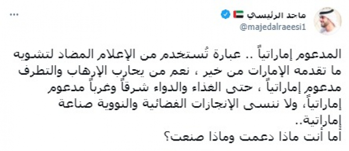 وقال في تغريدة على حسابه بموقع التدوين المصغر تويتر، اليوم إن: "المدعوم إماراتيا.. عبارة تُستخدم من الإعلام المضاد لتشويه ما تقدمه الإمارات من خير".