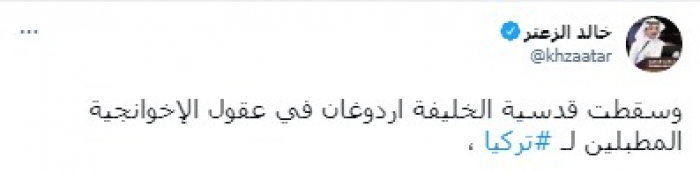 وقال في تغريدة على حسابه بموقع التدوين المصغر تويتر، اليوم: "وسقطت قدسية الخليفة أردوغان في عقول الإخوانجية المطبلين لتركيا".