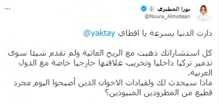 هاجمت الكاتبة نورا المطيري، مستشار الرئيس التركي ياسين أقطاي، بعد فشل مخططه في استغلال تنظيم الإخوان الإرهابي لمعاداة مصر.