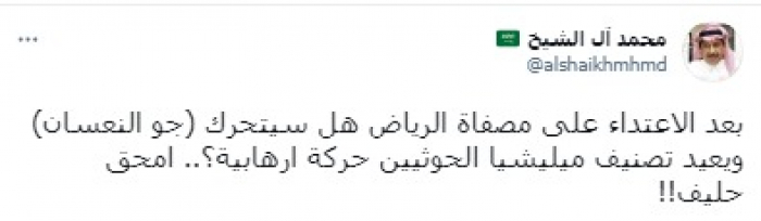 وقال في تغريدة على حسابه بموقع التدوين المصغر تويتر، اليوم إنه: "بعد الاعتداء على مصفاة الرياض هل سيتحرك (جو النعسان) ويعيد تصنيف ميليشيا الحوثيين حركة إرهابية؟.. امحق حليف!!".