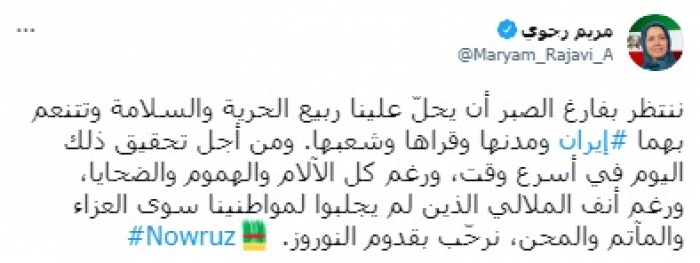 وتابعت: "ومن أجل تحقيق ذلك اليوم في أسرع وقت، ورغم كل الآلام والهموم والضحايا، ورغم أنف الملالي الذين لم يجلبوا لمواطنينا سوى العزاء والمآتم والمحن، نرحّب بقدوم النوروز".