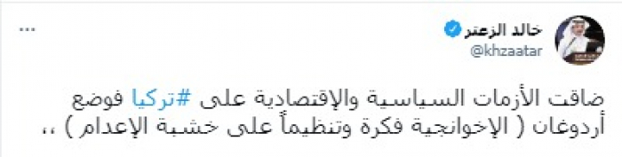 وقال في تغريدة على حسابه بموقع التدوين المصغر تويتر، اليوم: "ضاقت الأزمات السياسية والاقتصادية على تركيا، فوضع أردوغان (الإخوانجية فكرة وتنظيما على خشبة الإعدام)".