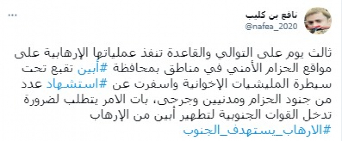 وقال في تغريدة على حسابه بموقع التدوين المصغر تويتر، اليوم إنه: "ثالث يوم على التوالي والقاعدة تنفذ عملياتها الإرهابية على مواقع الحزام الأمني في مناطق بمحافظة أبين تقبع تحت سيطرة المليشيات الإخوانية".