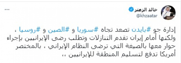 وأكد في تغريدة على حسابه بموقع التدوين المصغر تويتر، اليوم أن: "إدارة جو بايدن تصعد تجاه سوريا والصين وروسيا، ولكنها أمام إيران تقدم التنازلات".