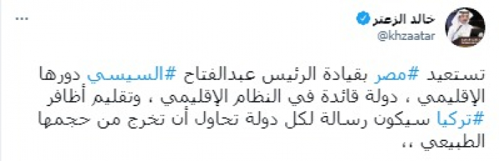 وقال في تغريدة على حسابه بموقع التدوين المصغر تويتر، اليوم إنه: "تستعيد مصر بقيادة الرئيس عبدالفتاح السيسي دورها الإقليمي".