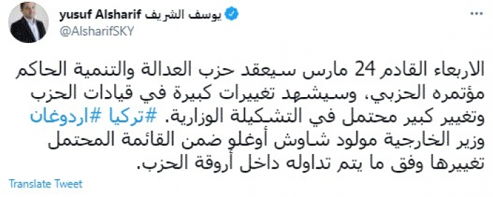 وقال في تغريدة عبر "تويتر" رصدها "المشهد العربي": "الأربعاء القادم 24 مارس سيعقد حزب العدالة والتنمية الحاكم مؤتمره الحزبي، وسيشهد تغييرات كبيرة في قيادات الحزب وتغيير كبير محتمل في التشكيلة الوزارية. وزير الخارجية مولود شاوش أوغلو ضمن القائمة المحتمل تغييرها وفق ما يتم تداوله داخل أروقة الحزب".
