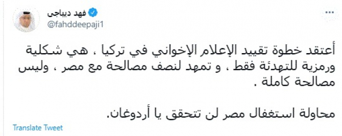 وقال في تغريدة عبر "تويتر" رصدها "المشهد العربي": "أعتقد خطوة تقييد الإعلام الإخواني في تركيا، هي شكلية ورمزية للتهدئة فقط ، وتمهد لنصف مصالحة مع مصر، وليس مصالحة كاملة. محاولة استغفال مصر لن تتحقق يا أردوغان".