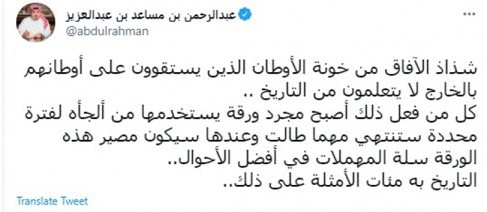هاجم الأمير السعودي البارز عبدالرحمن بن مساعد، اليوم، كل خائن يقوم ببيع وطنه لاجئًا للخارج مقابل الأموال، مشددًا على أنهم مجرد أداة يتم استخدامها لمصالح الدول المعادية.