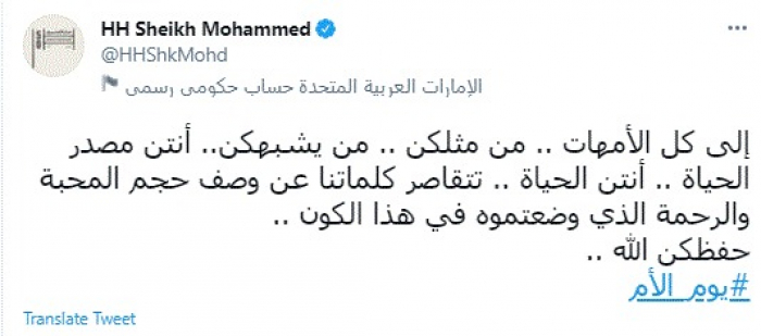 وقال في تغريدة عبر "تويتر" رصدها "المشهد العربي": "إلى كل الأمهات .. من مثلكن .. من يشبهكن.. أنتن مصدر الحياة .. أنتن الحياة .. تتقاصر كلماتنا عن وصف حجم المحبة والرحمة الذي وضعتموه في هذا الكون".