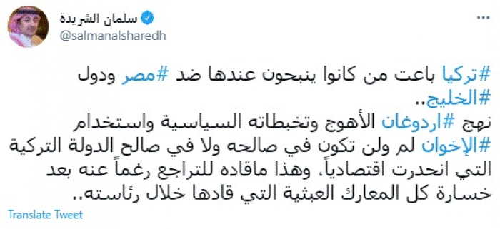 وقال في تغريدة عبر "تويتر" رصدها "المشهد العربي": "تركيا باعت من كانوا ينبحون عندها ضد مصر ودول الخليج.. نهج أردوغان الأهوج وتخبطاته السياسية واستخدام الإخوان لم ولن تكون في صالحه ولا في صالح الدولة التركية التي انحدرت اقتصادياً، وهذا ماقاده للتراجع رغماً عنه بعد خسارة كل المعارك العبثية التي قادها خلال رئاسته".