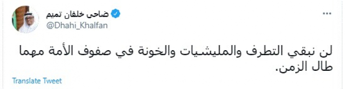 وقال في تغريدة عبر "تويتر" رصدها "المشهد العربي": "لن نبقي التطرف والمليشيات والخونة في صفوف الأمة مهما طال الزمن".