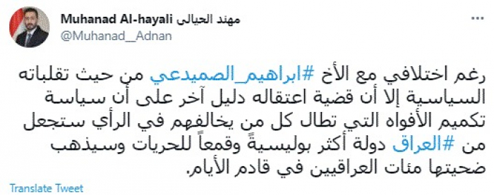 وكتب في تغريدة عبر "تويتر" رصدها "المشهد العربي": "رغم اختلافي مع الأخ إبراهيم الصميدعي من حيث تقلباته السياسية إلا أن قضية اعتقاله دليل آخر على أن سياسة تكميم الأفواه التي تطال كل من يخالفهم في الرأي ستجعل من العراق دولة أكثر بوليسيةً وقمعاً للحريات وسيذهب ضحيتها مئات العراقيين في قادم الأيام".