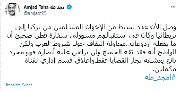 وقال في تغريدة عبر "تويتر" رصدها "المشهد العربي": "وصل الآن عدد بسيط من الإخوان المسلمين من تركيا إلى بريطانيا وكان في استقبالهم مسؤولي سفارة قطر. صحيح أن ما يفعله أردوغان محاولة التفاف حول شروط العرب ولكن الواضح أنه فقد ثقة الجميع ولن يراهن عليه أنصاره فهو مجرد بائع يعشقه تجار القضايا فقط.وإغلاق قسم إداري لقناة مكملين".