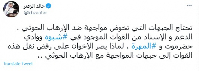 وقال في تغريدة عبر "تويتر" رصدها "المشهد العربي": "تحتاج الجبهات التي تخوض مواجهة ضد الإرهاب الحوثي، الدعم و الإسناد من القوات الموجود في شبوة ووادي حضرموت والمهرة ، لماذا يصر الإخوان على رفض نقل هذه القوات إلى جبهات المواجهة مع الإرهاب الحوثي".