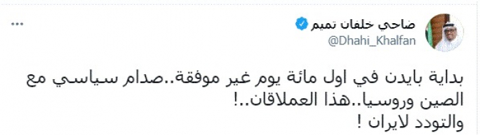 وكتب في تغريدة عبر "تويتر" رصدها "المشهد العربي": "بداية بايدن في اول مائة يوم غير موفقة..صدام سياسي مع الصين وروسيا..هذا العملاقان.. والتودد لإيران".