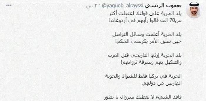 وأضاف: "بلد الحرية إرثها التاريخي قتل العرب والتنكيل بهم وسرقة ثرواتهم! الحرية في تركيا فقط .... والخونة الهاربين من دولهم. فاقد الشيء لا يعطيك ... يا ....".