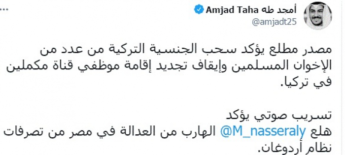 وقال في تغريدة عبر "تويتر" رصدها "المشهد العربي": "مصدر مطلع يؤكد سحب الجنسية التركية من عدد من الإخوان المسلمين وإيقاف تجديد إقامة موظفي قناة مكملين في تركيا. تسريب صوتي يؤكدهلع محمد ناصر الهارب من العدالة في مصر من تصرفات نظام أردوغان".