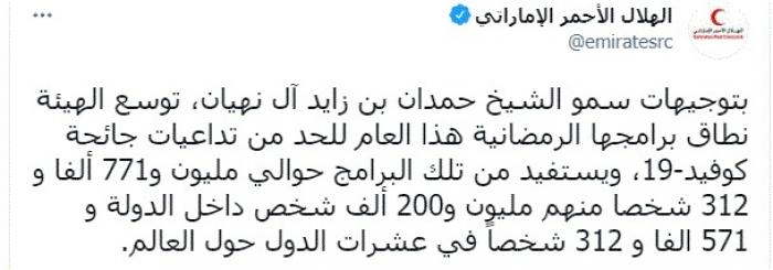 وقال في تغريدة عبر "تويتر" رصدها "المشهد العربي": "بتوجيهات سمو الشيخ حمدان بن زايد آل نهيان، توسع الهيئة نطاق برامجها الرمضانية هذا العام للحد من تداعيات جائحة كوفيد-19، ويستفيد من تلك البرامج حوالي مليون و771 ألفا و 312 شخصا منهم مليون و200 ألف شخص داخل الدولة و 571 الفا و 312 شخصاً في عشرات الدول حول العالم".