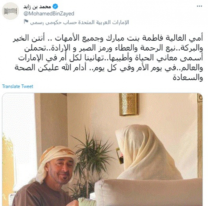 وقال في تغريدة عبر "تويتر" رصدها "المشهد العربي": "أمي الغالية فاطمة بنت مبارك وجميع الأمهات .. أنتن الخير والبركة..نبع الرحمة والعطاء ورمز الصبر و الإرادة..تحملن أسمى معاني الحياة وأطيبها..تهانينا لكل أم في الإمارات والعالم..في يوم الأم وفي كل يوم.. أدام الله عليكن الصحة والسعادة".