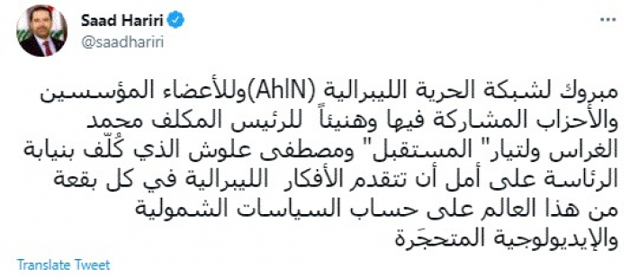 هنّأ رئيس الوزراء اللبناني المكلف سعد الحريري، اليوم، شبكة الحرية الليبرالية لانتخابها كل من محمد الغراس رئيسًا مكلفاً ومصطفى علوش نائبًا للرئيس.