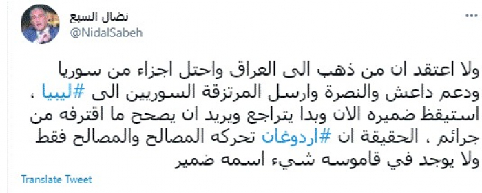 وقال في تغريدة عبر "تويتر" رصدها "المشهد العربي": "ولا أعتقد أن من ذهب إلى العراق واحتل أجزاء من سوريا ودعم داعش والنصرة وأرسل المرتزقة السوريين إلى ليبيا، استيقظ ضميره الآن وبدأ يتراجع ويريد أن يصحح ما اقترفه من جرائم".